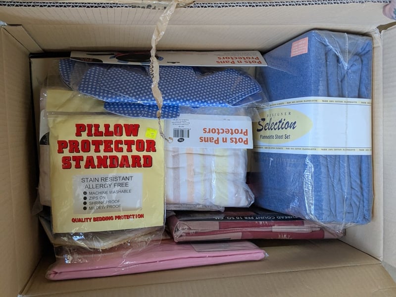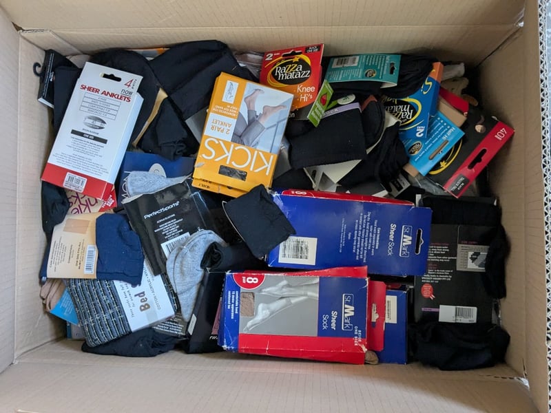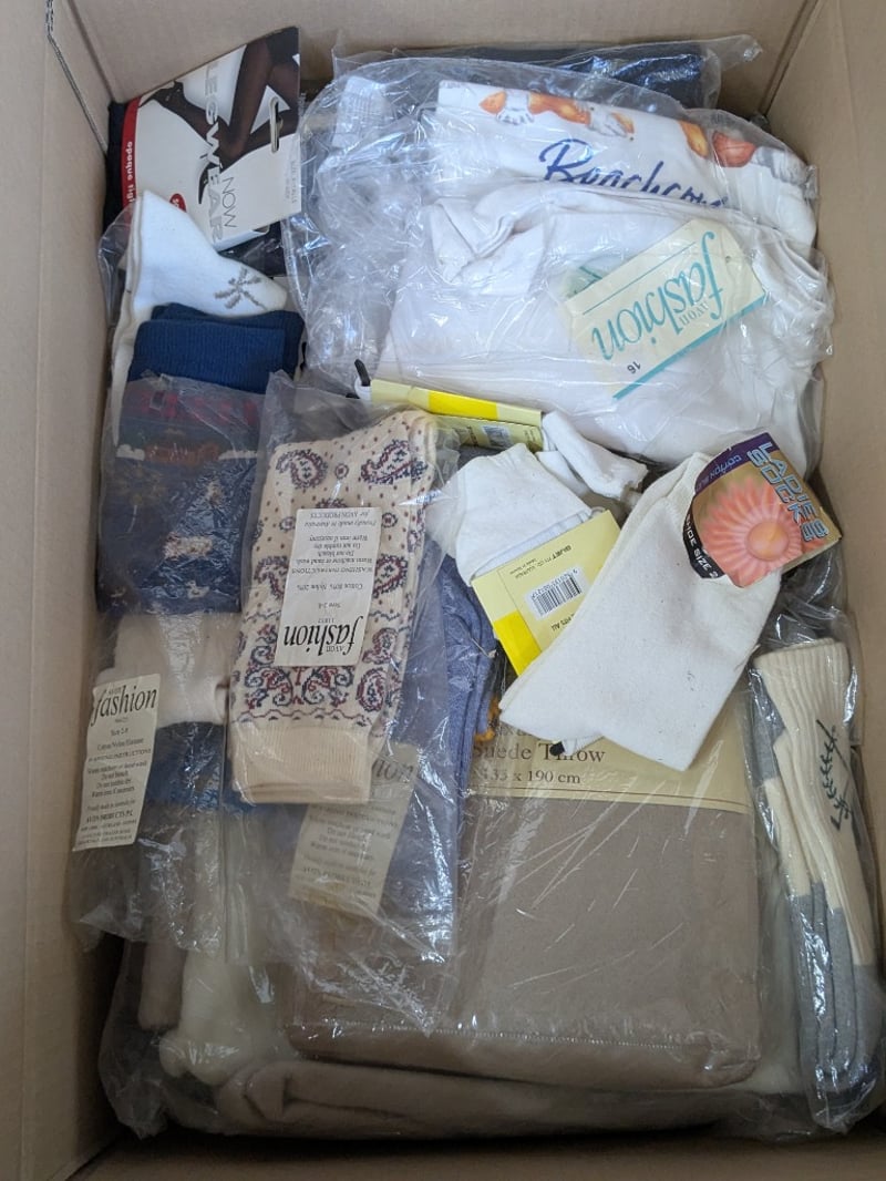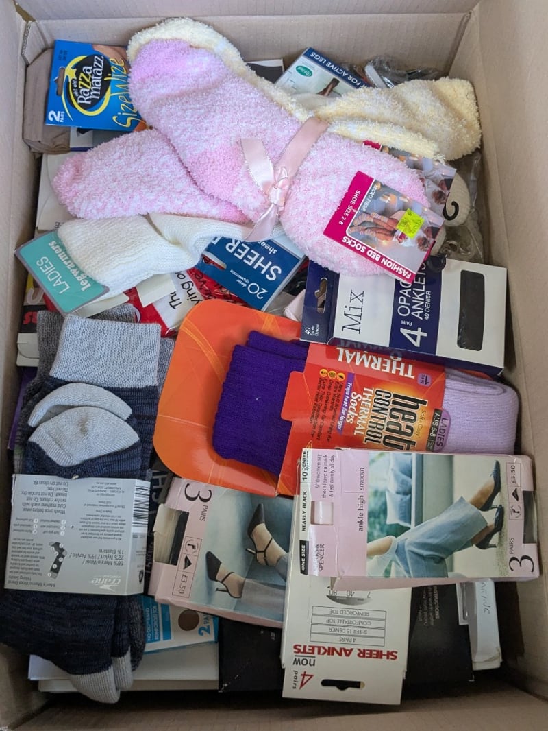 Homewares, 7 boxes includes assorted new sock/ stockings, women's shoes, linen and more