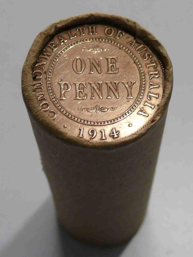ROLL OF KGV AUSTRALIAN PENNY, UNKNOWN MIX YEARS, 1911-1937 (50X CIRCULATED COINS IN A ROLL). 488381+1