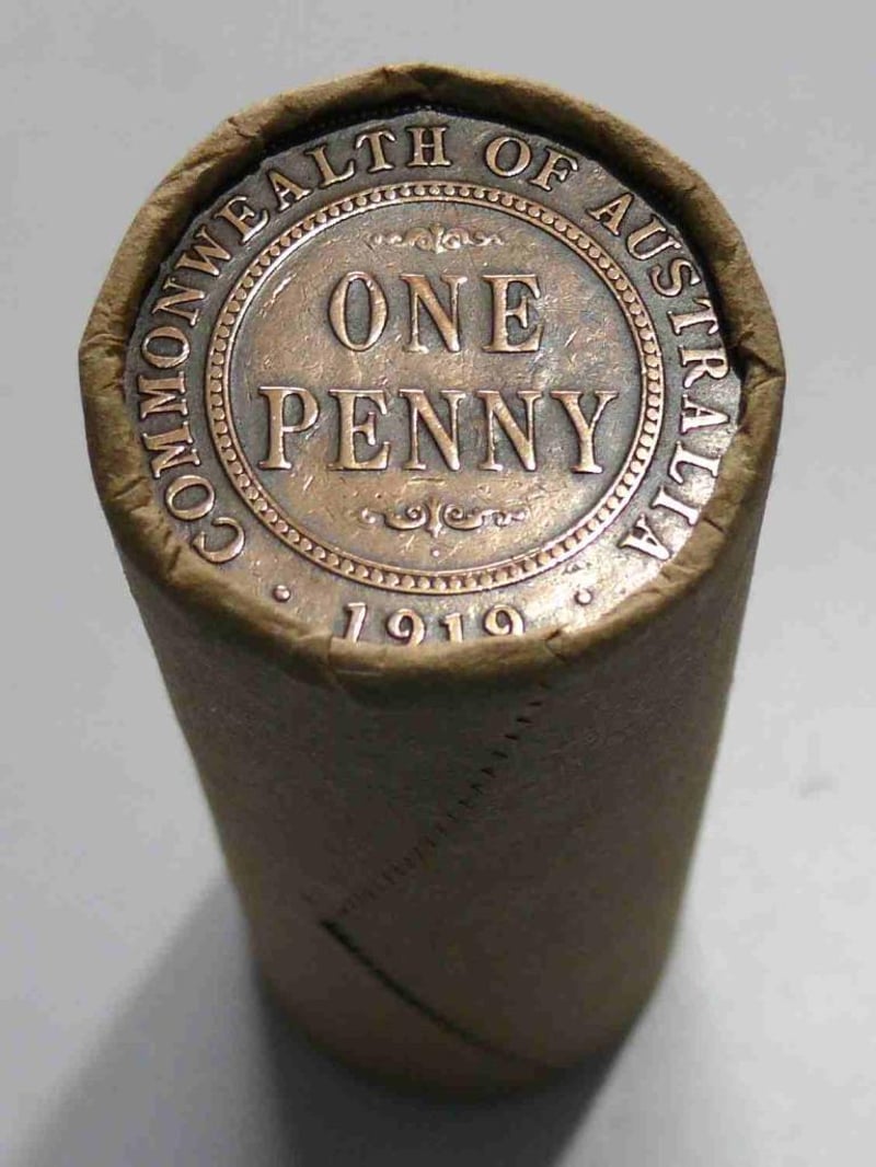 ROLL OF 1919 KGV AUSTRALIAN PENNY (50X CIRCULATED COINS IN A ROLL). 488381+2