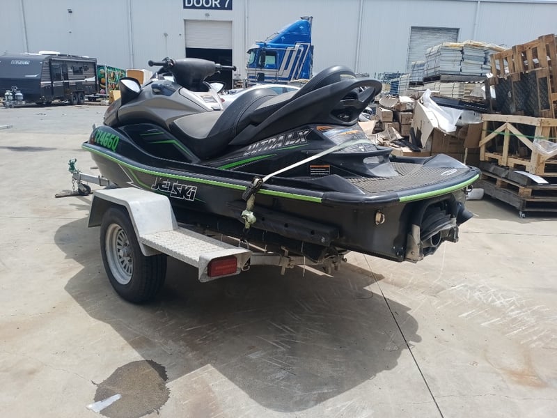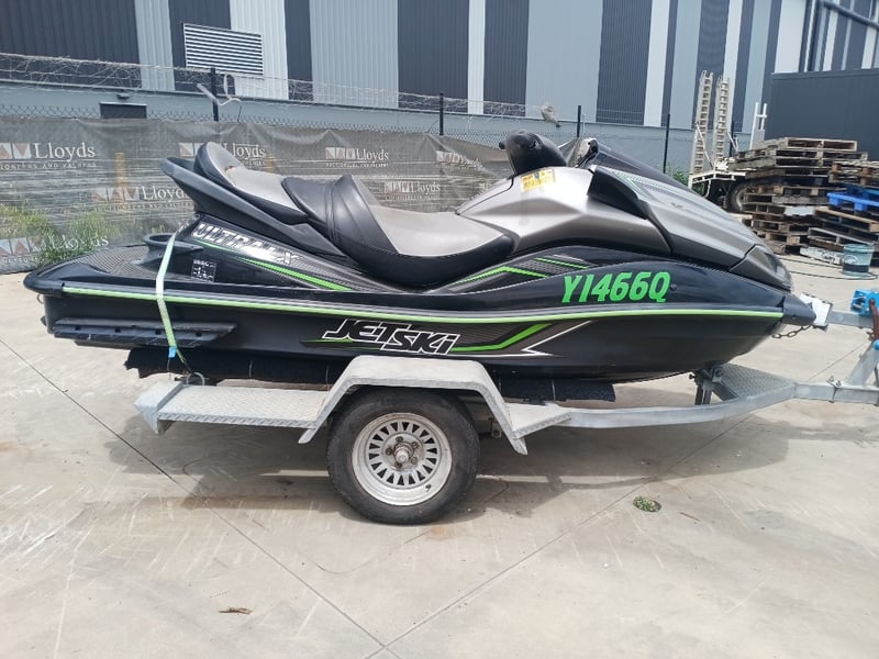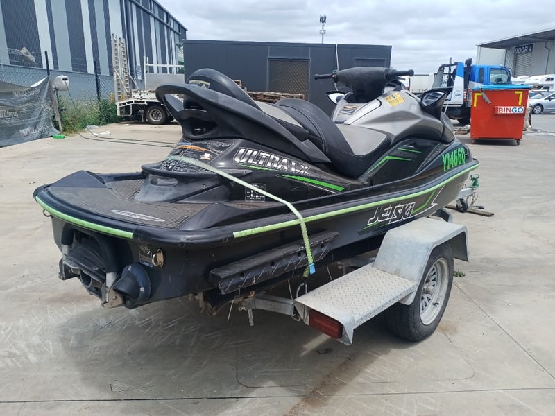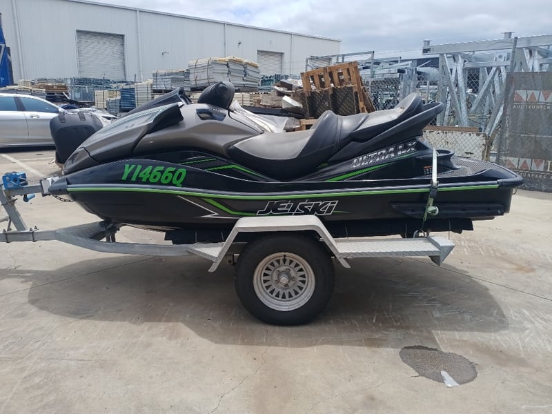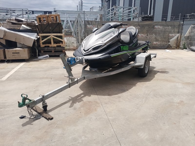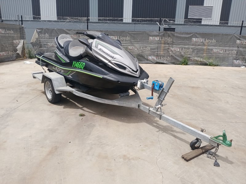 2014 Kawasaki Ultra LX JetSki on TrailerYear: 2014Make: KawasakiModel: Ultra LXBody: JetSkiHull Material: Fibre GlassCapacity: 3Colour: Black/GreenEngine: 160hp 4 StrokeTotal length on trailer: 4600 mmTrailer width: 1900 mmVessel length: 3400 mmDescription/Extras:Vendor advises has been sitting in shed for a year and a half. Turns over but doesn't start. Suspected bad earth.HIN: US-KAW50080G415ON A TRAILER:Body: Jetski TrailerColour: SilverConfiguration: Single axleSuspension: LeafDescription:Chassis No.: Chassis number will need to be allocated prior to registrationTotal length: 4200 mmKey #B6