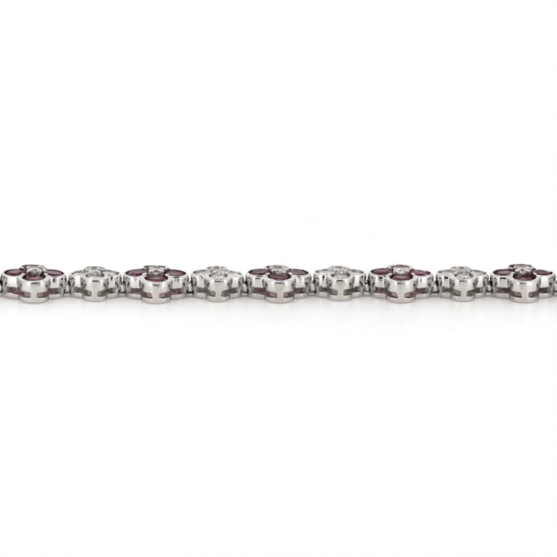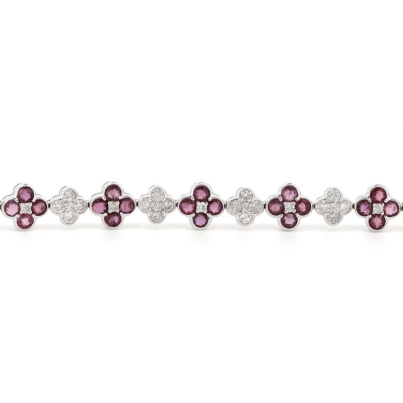 14K WHITE GOLD, RUBY AND DIAMOND, FLORAL BRACELET.