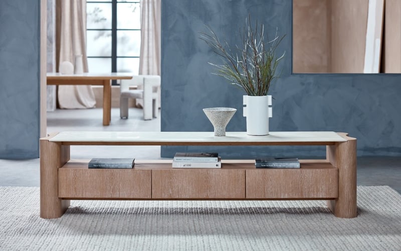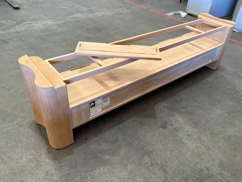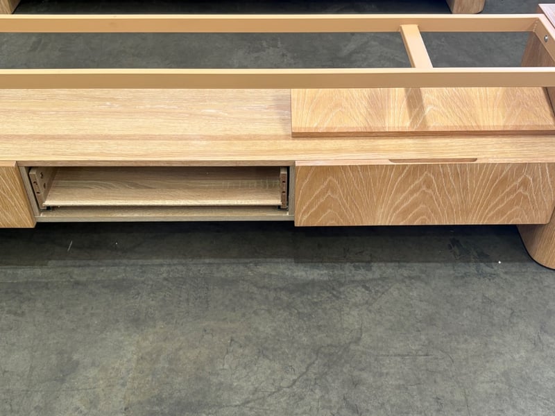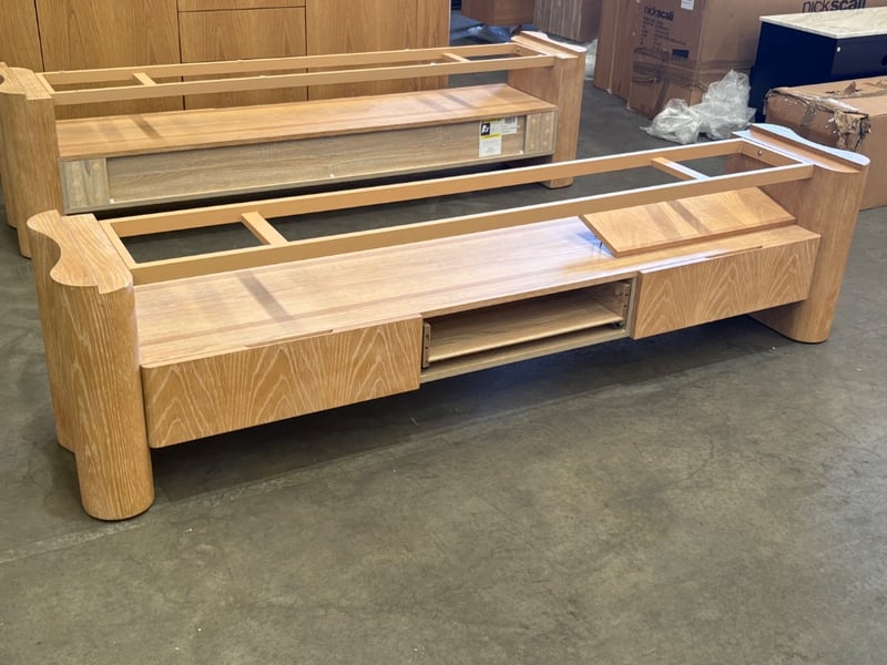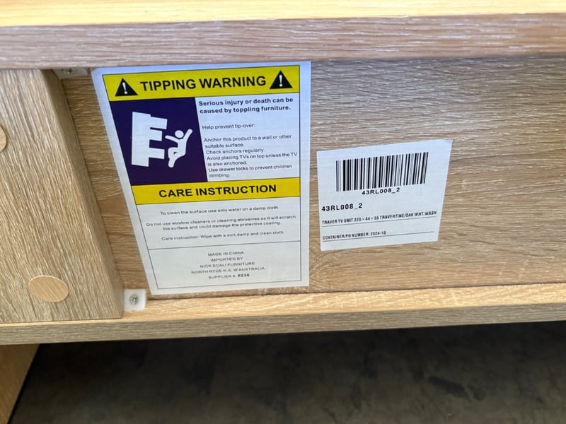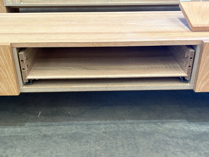 RRP$2890. Tv Entertainment Unit. White washed oak timber with marble style top. Package Dimensions 215x52x10, 227.5x51.5x64 Note: There is damage to this unit. Inspections recommended.