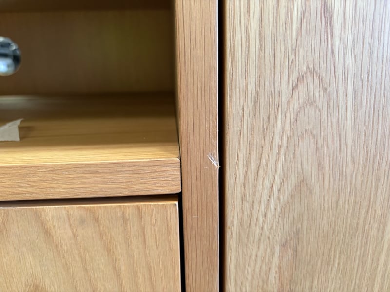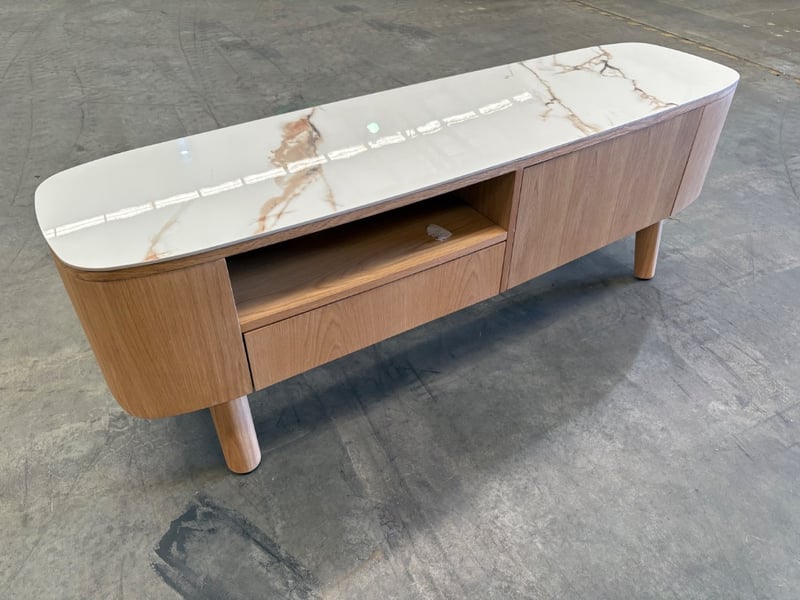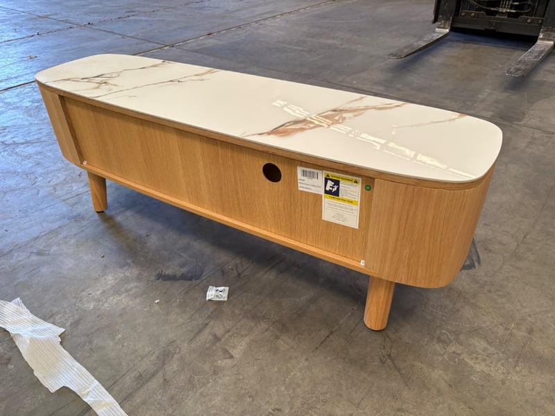 RRP$2690. TV Entertainment Unit. Oak Timber Style with Ceramic Top. Dimensions : approx 167.5x51.5x45 Note : This Item has Damage. Inspections Recommended.