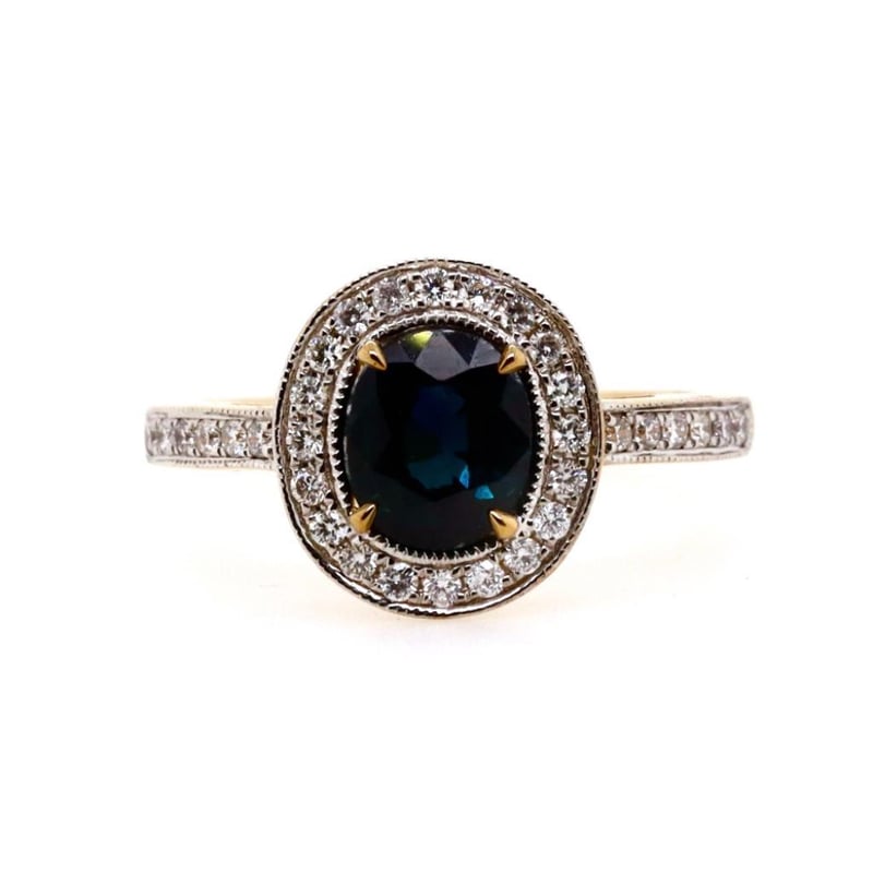 14CT YELLOW GOLD AUSTRALIAN SAPPHIRE AND DIAMOND HALO RING 14Ct Yellow Gold Australian Sapphire And Diamond Halo Ring Featuring Centre, One Oval Cut, Deep Blue-Green Australian Sapphire (1.37Ct, Moderately Included), Claw Set, With 32 Round Brilliant Cut Diamonds (0.25Ct Tdw, G-H Colour, Si1-Si2 Clarity), Bead Set In White Gold. Ring Size M. Valuations Provided by an Independent Third-Party Professional Not Directly Associated With Lloyds Auctions at AUD $10000This valuation has been conducted by an independent third-party professional. The valuation amount is an assessment by the issuing valuer and does not reflect the auction value of the item. Any inquiries regarding the valuation should be directed to the issuing valuer (refer to contact details on the certificate), as Lloyds Auctions has no affiliation or influence over the valuation, the valuer, or the stated amount. Condition: Good - Refer Images 0+1556