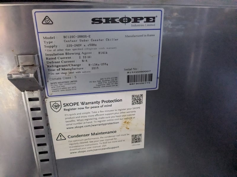 Refrigerator, Skope Centaur Under Counter Chiller (BC120C-2RROS-E)Approximate measurement W120cm D69cm H85cmCondition unknown
