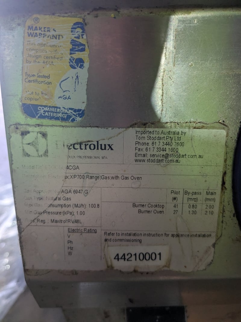 Oven, Electrolux XP700, Gas Oven, Model no. E7GCGH4CGA Approximate dimensions W80cm D73cm H90cm Condition unknown