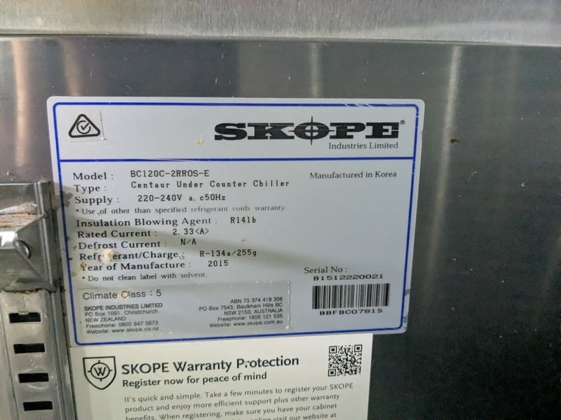 Refrigerator, SKOPE Centaur Under Counter Chiller (BC120C-2RR0S-E) Approximate dimensions W120CM D67CM H85cm Condition unknown