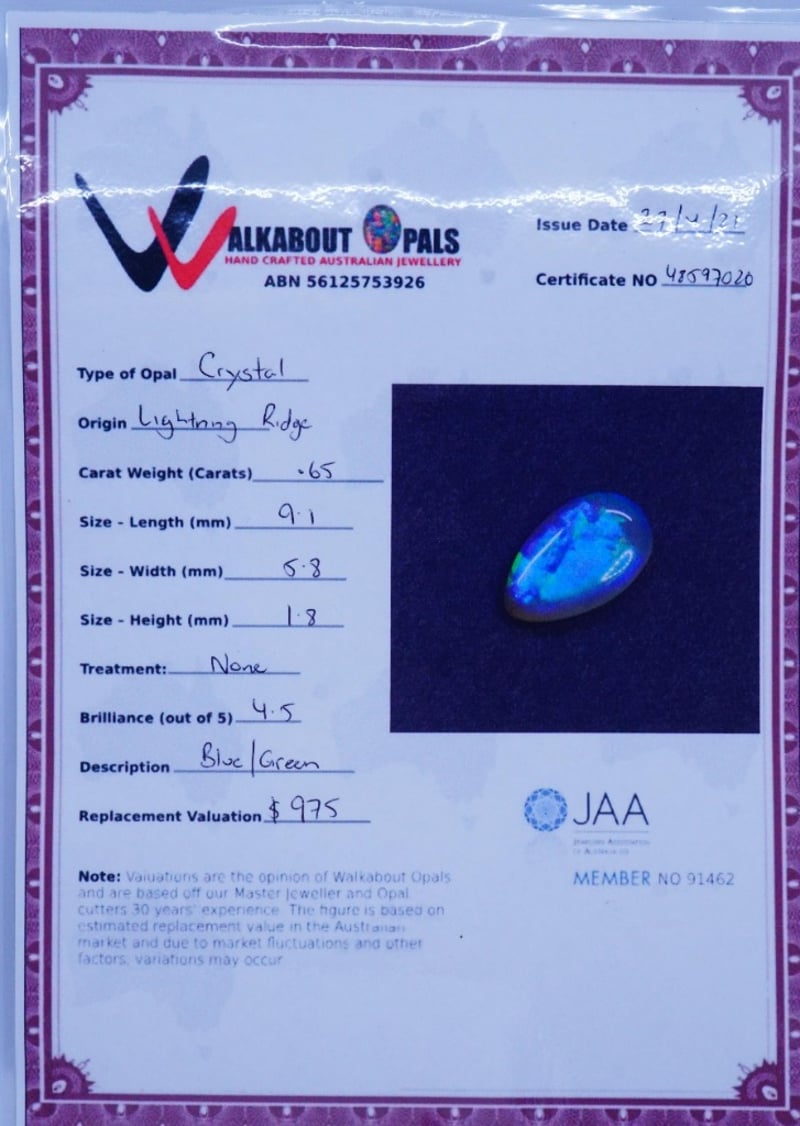 CRYSTAL OPAL 0.65CTThis valuation has been conducted by an independent third-party professional. The valuation amount is an assessment by the issuing valuer and does not reflect the auction value of the item.Any inquiries regarding the valuation should be directed to the issuing valuer (refer to contact details on the certificate), as Lloyds Auctions has no affiliation or influence over the valuation, the valuer, or the stated amount.Insurance Replacement Valuation Amount: $975.00488371+24