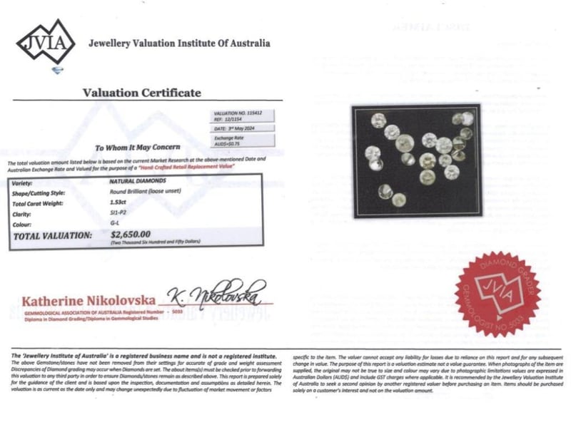 1.53CT TDW, NATURAL DIAMONDS, ROUND BRILLIANT CUT. G-L Colour, Si1-P2 Clarity, Loose, Unset. Jewellery Valuations Provided By A Third Party Professional Not Directly Associated With Lloyds Auctions at AUD $2,650.00 This Insurance Valuation has been provided by a registered Jewellery Valuer and is intended for insurance purposes only. The valuation amount has no bearing on the auction value of the item. Any questions regarding the valuation should be directed to the issuing Valuer (refer to contact details on the certificate) as Lloyds have no association or relationship with the Valuer or the valuation amount contained within the valuation. Condition: Good - Refer to Images 0 FC1 163022+1