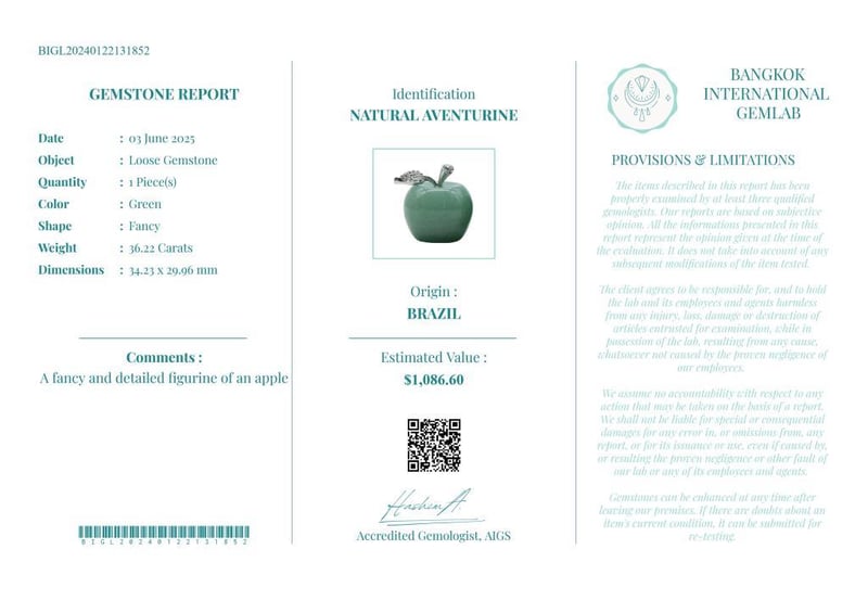 36.22 CARATS CERTIFIED NATURAL AVENTURINE Gemstone : Natural AventurineCertificate Number : Bigl20240122131852Weight : 36.22 CaratsColor : GreenMeasurement : 34.23 X 29.96 MmShape : FancyQuantity : 1 PieceOrigin : BrazilComments : A Fancy And Detailed Figurine Of An Apple• Use The Qr Code On The Packaging To View And Download The Certificate. • Verify Report Online At Www.Bangkokinternationalgemlab.Co 0+10