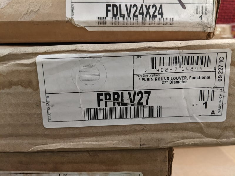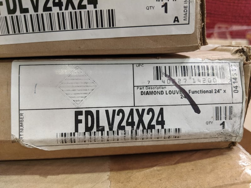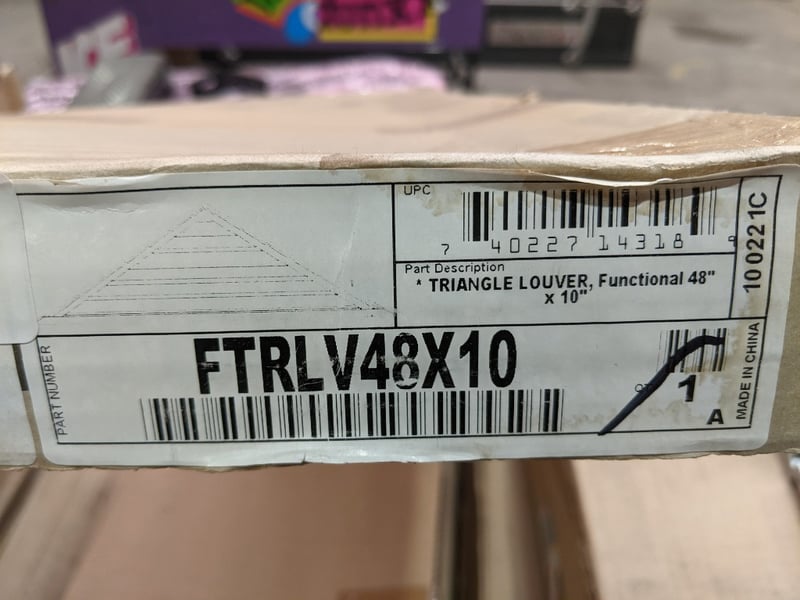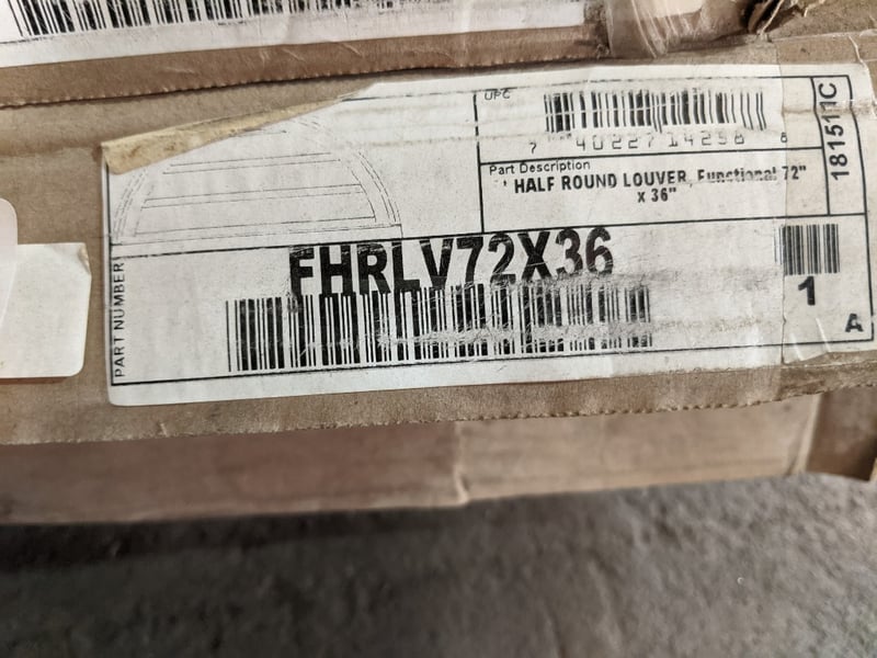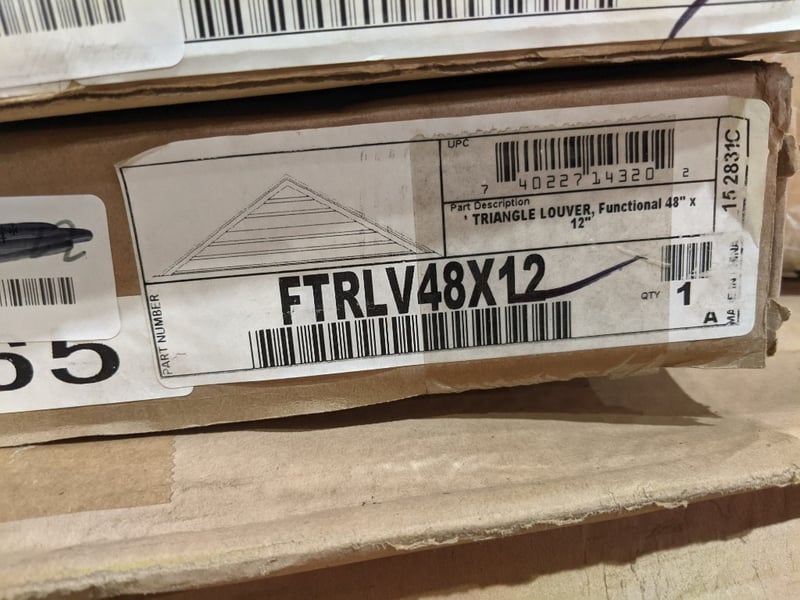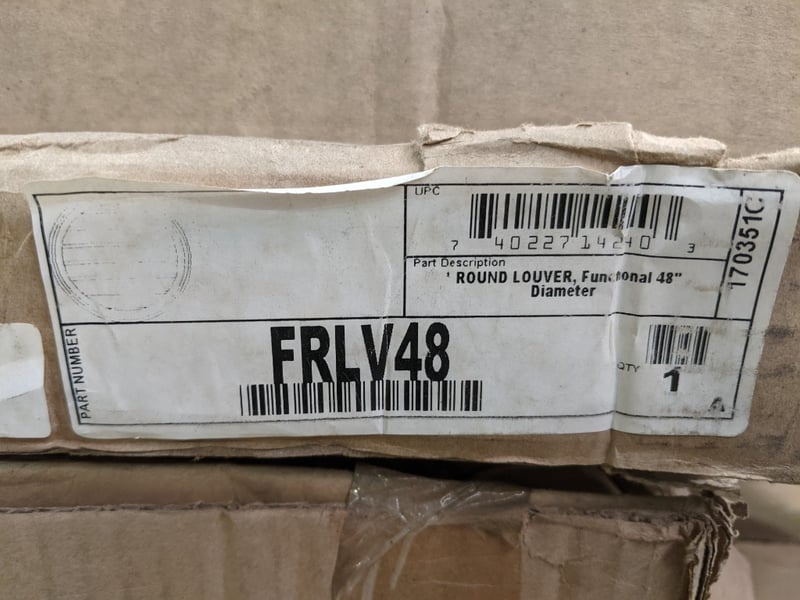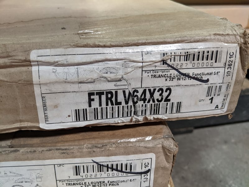 Assorted items include: - FTRLV48X10, Triangle Louver, Functional 48'' x 10''- FDLV24X24, Diamond Louver, Functional 24'' x 24''- FPRLV27, Plain Round Louver, Functional 27'' Diameter- FRLV48, Round Louver, Functional 48'' Diameter- FTRLV48X12, Triangle Louver, Functional 48'' x 12''- FTRLV64X32, Triangle Louver, Functional 64'' x 32'' W/12/12 Pitch- FHRLV72X36, Half Round Louver, Functional 72'' x 36''Qty: 17 items, sold as lot