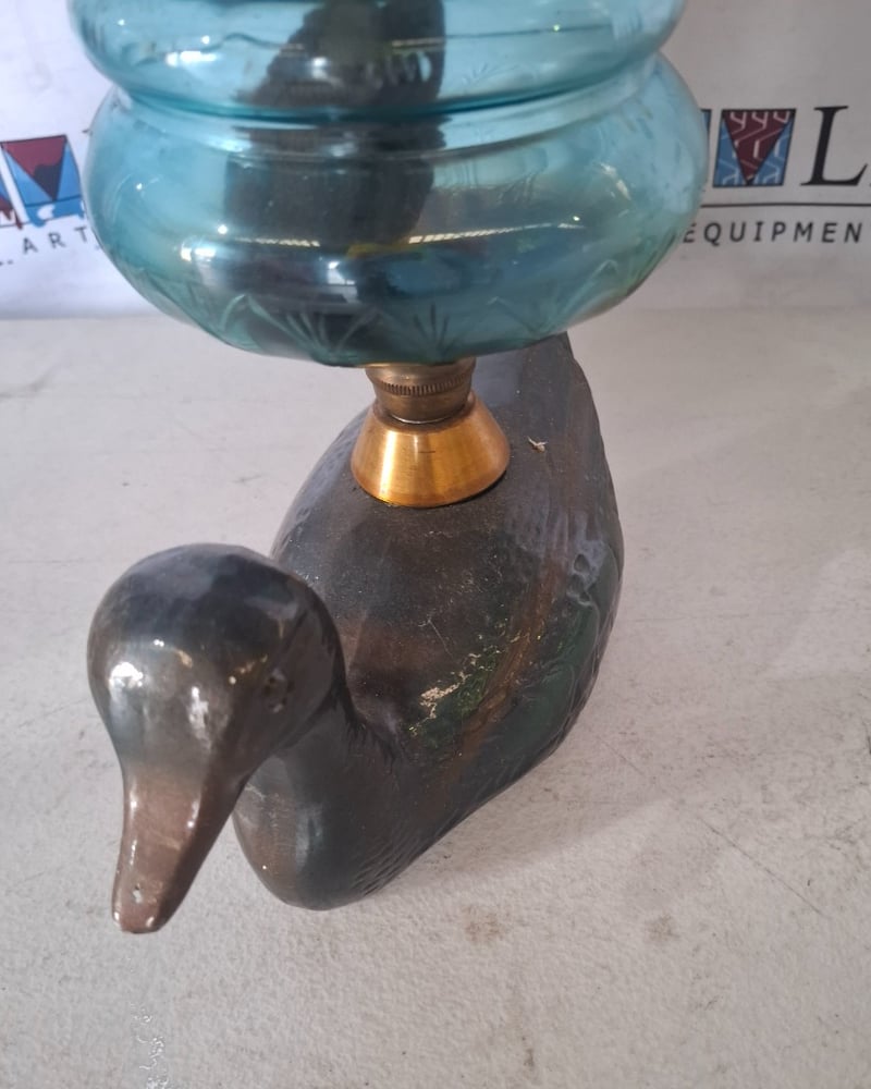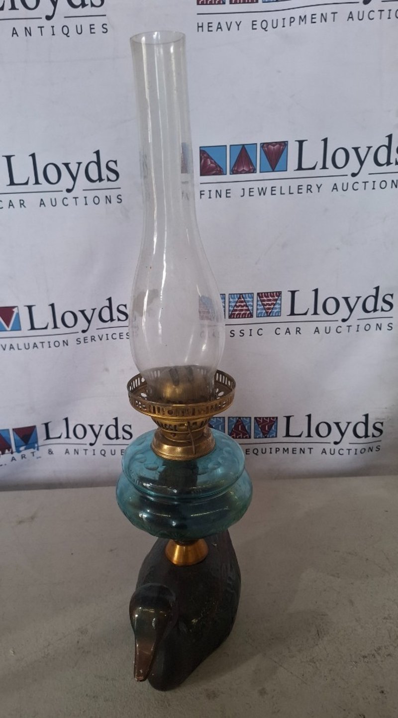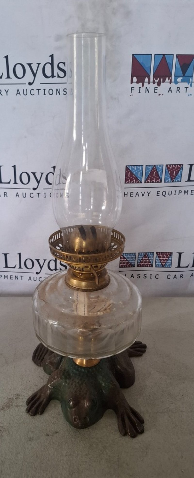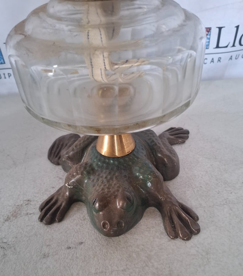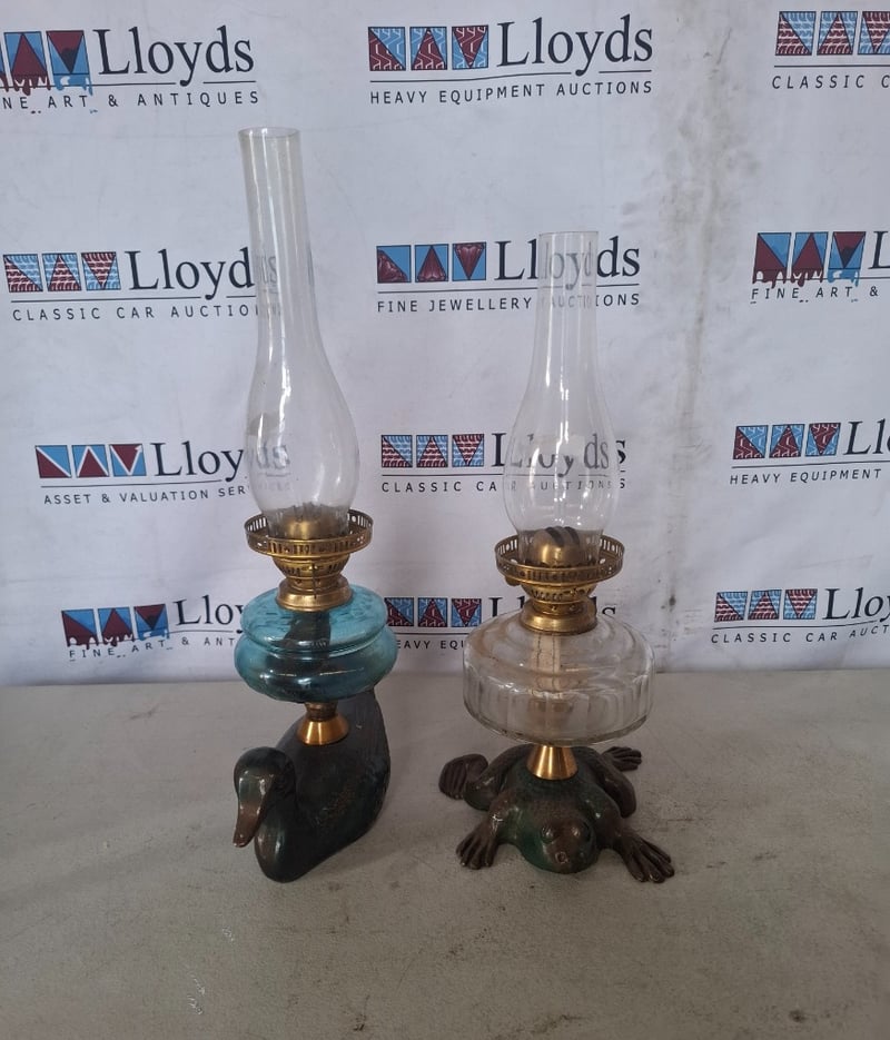 Oil Lamps with Duck Base and Frog Base, Glass and Metal Style Note: Cleaning May Be Required, Working Condition Unknown Inspection Recommended