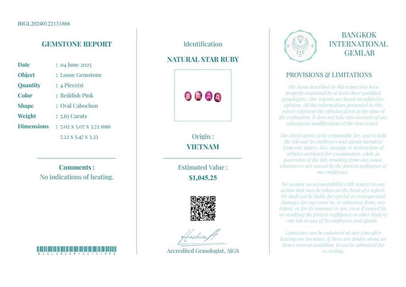 5.65 CARATS CERTIFIED NATURAL STAR RUBY Gemstone : Natural Star RubyCertificate Number : Bigl20240122131866Weight : 5.65 CaratsColor : Reddish PinkMeasurement : 7.02 X 5.07 X 3.72 MmShape : Oval CabochonQuantity : 4 PieceOrigin : VietnamComments : No Indications Of Heating.• Use The Qr Code On The Packaging To View And Download The Certificate. • Verify Report Online At Www.Bangkokinternationalgemlab.Co 0+11