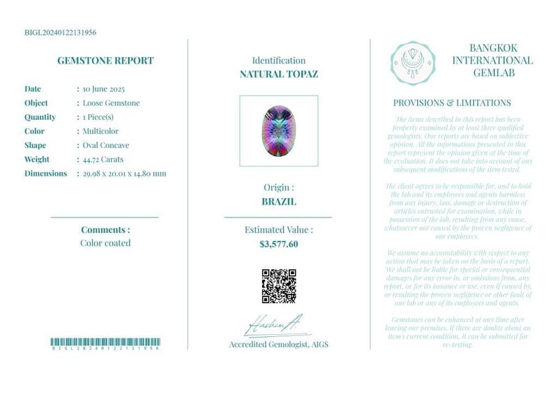 44.72 CARATS CERTIFIED NATURAL TOPAZ Gemstone : Natural TopazCertificate Number : Bigl20240122131956Weight : 44.72 CaratsColor : MulticolorMeasurement : 29.98 X 20.01 X 14.80 MmShape : Oval ConcaveQuantity : 1 PieceOrigin : BrazilComments : Color Coated• Use The Qr Code On The Packaging To View And Download The Certificate. • Verify Report Online At Www.Bangkokinternationalgemlab.Co 0+17