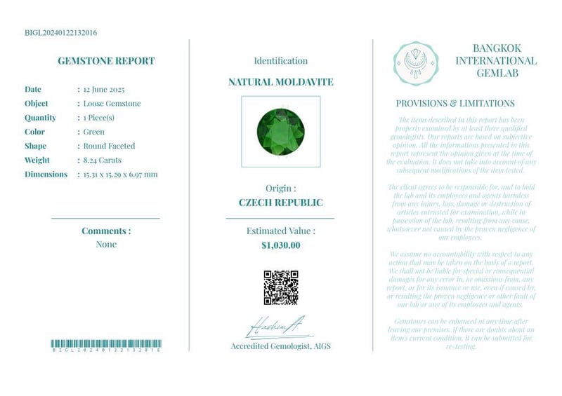 8.24 CARATS CERTIFIED NATURAL MOLDAVITE Gemstone : Natural MoldaviteCertificate Number : Bigl20240122132016Weight : 8.24 CaratsColor : GreenMeasurement : 15.31 X 15.29 X 6.97 MmShape : Round FacetedQuantity : 1 PieceOrigin : Czech RepublicComments : None• Use The Qr Code On The Packaging To View And Download The Certificate. • Verify Report Online At Www.Bangkokinternationalgemlab.Co 0+21