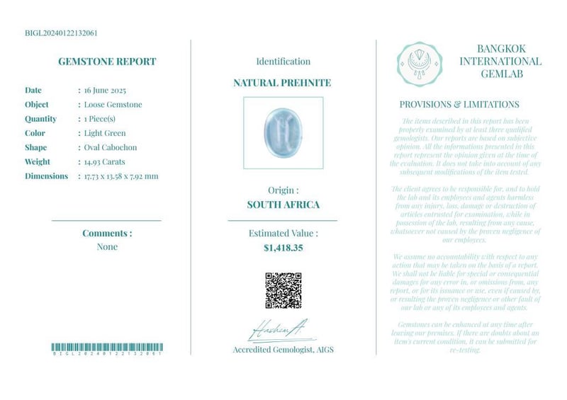 14.93 CARATS CERTIFIED NATURAL PREHNITE Gemstone : Natural PrehniteCertificate Number : Bigl20240122132061Weight : 14.93 CaratsColor : Light GreenMeasurement : 17.73 X 13.58 X 7.92 MmShape : Oval CabochonQuantity : 1 PieceOrigin : South AfricaComments : None• Use The Qr Code On The Packaging To View And Download The Certificate. • Verify Report Online At Www.Bangkokinternationalgemlab.Co 0+24