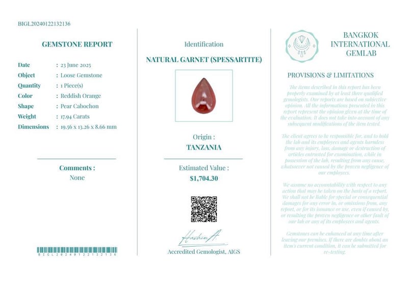 17.94 CARATS CERTIFIED NATURAL GARNET (SPESSARTITE) Gemstone : Natural Garnet (Spessartite)Certificate Number : Bigl20240122132136Weight : 17.94 CaratsColor : Reddish OrangeMeasurement : 19.56 X 13.26 X 8.66 MmShape : Pear CabochonQuantity : 1 PieceOrigin : TanzaniaComments : None• Use The Qr Code On The Packaging To View And Download The Certificate. • Verify Report Online At Www.Bangkokinternationalgemlab.Co 0+29
