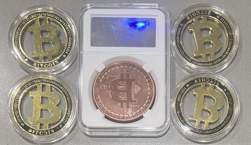 4 X BITCOIN COINS IN CASE AND 1 BITCOIN IN SLAB CASE 23528+57