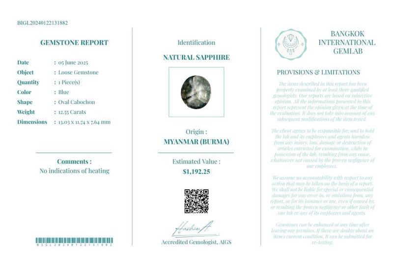 12.55 CARATS CERTIFIED NATURAL SAPPHIRE Gemstone : Natural SapphireCertificate Number : Bigl20240122131882Weight : 12.55 CaratsColor : BlueMeasurement : 13.03 X 11.74 X 7.64 MmShape : Oval CabochonQuantity : 1 PieceOrigin : Myanmar (Burma)Comments : No Indications Of Heating• Use The Qr Code On The Packaging To View And Download The Certificate. • Verify Report Online At Www.Bangkokinternationalgemlab.Co 0+12