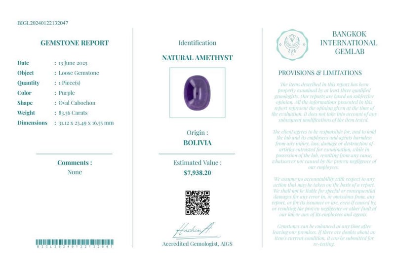 83.56 CARATS CERTIFIED NATURAL AMETHYST Gemstone : Natural AmethystCertificate Number : Bigl20240122132047Weight : 83.56 CaratsColor : PurpleMeasurement : 31.12 X 23.49 X 16.55 MmShape : Oval CabochonQuantity : 1 PieceOrigin : BoliviaComments : None• Use The Qr Code On The Packaging To View And Download The Certificate. • Verify Report Online At Www.Bangkokinternationalgemlab.Co 0+23