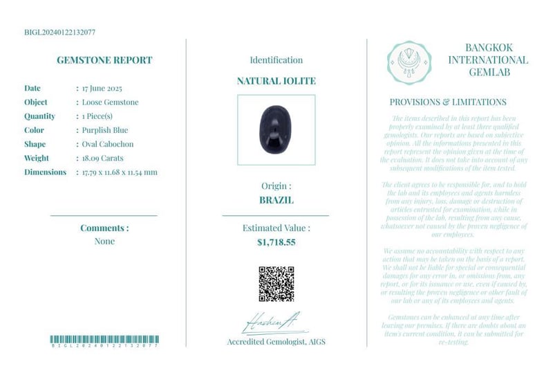 18.09 CARATS CERTIFIED NATURAL IOLITE Gemstone : Natural IoliteCertificate Number : Bigl20240122132077Weight : 18.09 CaratsColor : Purplish BlueMeasurement : 17.79 X 11.68 X 11.54 MmShape : Oval CabochonQuantity : 1 PieceOrigin : BrazilComments : None• Use The Qr Code On The Packaging To View And Download The Certificate. • Verify Report Online At Www.Bangkokinternationalgemlab.Co 0+25
