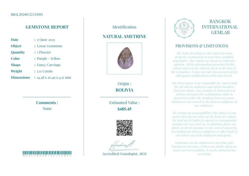 5.11 CARATS CERTIFIED NATURAL AMETRINE Gemstone : Natural AmetrineCertificate Number : Bigl20240122132092Weight : 5.11 CaratsColor : Purple - YellowMeasurement : 14.48 X 10.49 X 4.51 MmShape : Fancy CarvingsQuantity : 1 PieceOrigin : BoliviaComments : None• Use The Qr Code On The Packaging To View And Download The Certificate. • Verify Report Online At Www.Bangkokinternationalgemlab.Co 0+26