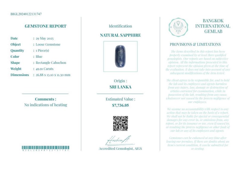 49.91 CARATS CERTIFIED NATURAL SAPPHIRE Gemstone : Natural SapphireCertificate Number : Bigl20240122131747Weight : 49.91 CaratsColor : BlueMeasurement : 26.88 X 13.10 X 11.30 MmShape : Rectangle CabochonQuantity : 1 PieceOrigin : Sri LankaComments : No Indications Of Heating• Use The Qr Code On The Packaging To View And Download The Certificate. • Verify Report Online At Www.Bangkokinternationalgemlab.Co 0+3