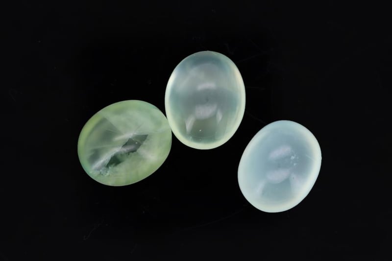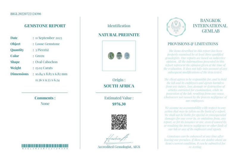 15.02 CARATS CERTIFIED NATURAL PREHNITE Gemstone : Natural PrehniteCertificate Number : Bigl20220722124396Weight : 15.02 CaratsColor : GreenMeasurement : 10.84 X 8.85 X 6.82 MmShape : Oval CabochonQuantity : 3 PieceOrigin : South AfricaComments : None• Use The Qr Code On The Packaging To View And Download The Certificate. • Verify Report Online At Www.Bangkokinternationalgemlab.Co 0+35