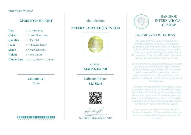 53.96 CARATS CERTIFIED NATURAL APATITE (CAT'S EYE) Gemstone : Natural Apatite (Cat'S Eye)Certificate Number : Bigl20240122132242Weight : 53.96 CaratsColor : Yellowish GreenMeasurement : 21.33 X 19.50 X 15.39 MmShape : Oval CabochonQuantity : 1 PieceOrigin : MadagascarComments : None• Use The Qr Code On The Packaging To View And Download The Certificate. • Verify Report Online At Www.Bangkokinternationalgemlab.Co 0+36