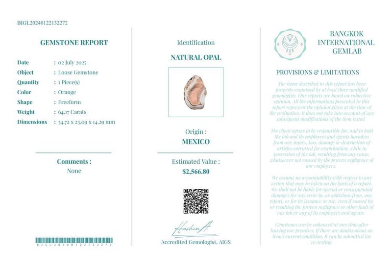 64.17 CARATS CERTIFIED NATURAL OPAL Gemstone : Natural OpalCertificate Number : Bigl20240122132272Weight : 64.17 CaratsColor : OrangeMeasurement : 34.72 X 23.09 X 14.29 MmShape : FreeformQuantity : 1 PieceOrigin : MexicoComments : None• Use The Qr Code On The Packaging To View And Download The Certificate. • Verify Report Online At Www.Bangkokinternationalgemlab.Co 0+38