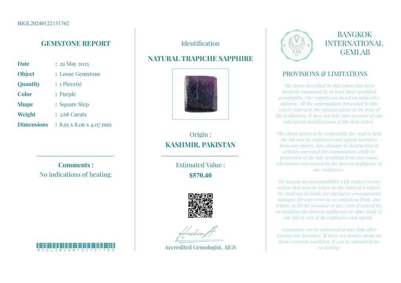 3.68 CARATS CERTIFIED NATURAL TRAPICHE SAPPHIRE Gemstone : Natural Trapiche SapphireCertificate Number : Bigl20240122131762Weight : 3.68 CaratsColor : PurpleMeasurement : 8.95 X 8.06 X 4.07 MmShape : Square StepQuantity : 1 PieceOrigin : Kashmir, PakistanComments : No Indications Of Heating.• Use The Qr Code On The Packaging To View And Download The Certificate. • Verify Report Online At Www.Bangkokinternationalgemlab.Co 0+4