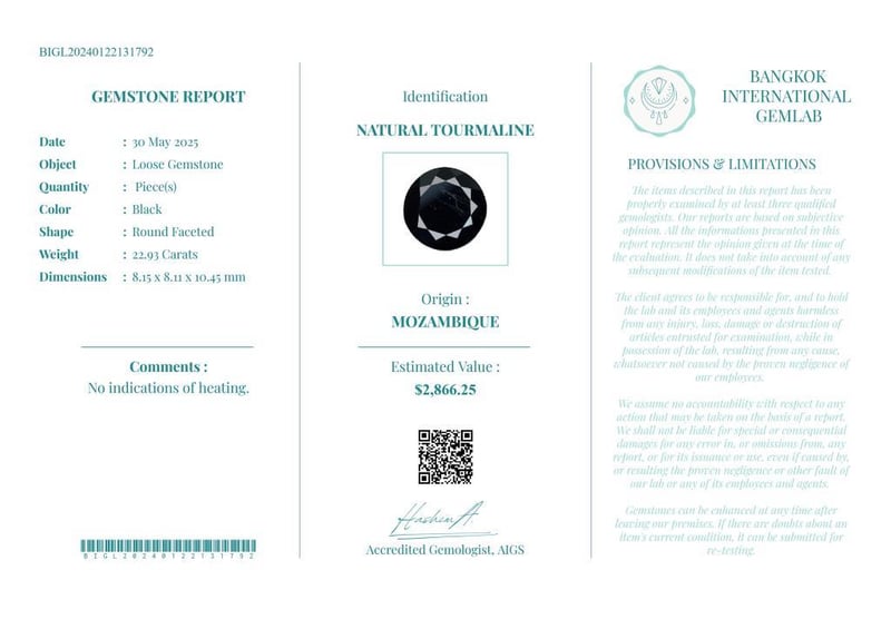 22.93 CARATS CERTIFIED NATURAL TOURMALINE Gemstone : Natural TourmalineCertificate Number : Bigl20240122131792Weight : 22.93 CaratsColor : BlackMeasurement : 8.15 X 8.11 X 10.45 MmShape : Round FacetedQuantity : 1 PieceOrigin : MozambiqueComments : No Indications Of Heating.• Use The Qr Code On The Packaging To View And Download The Certificate. • Verify Report Online At Www.Bangkokinternationalgemlab.Co 0+6