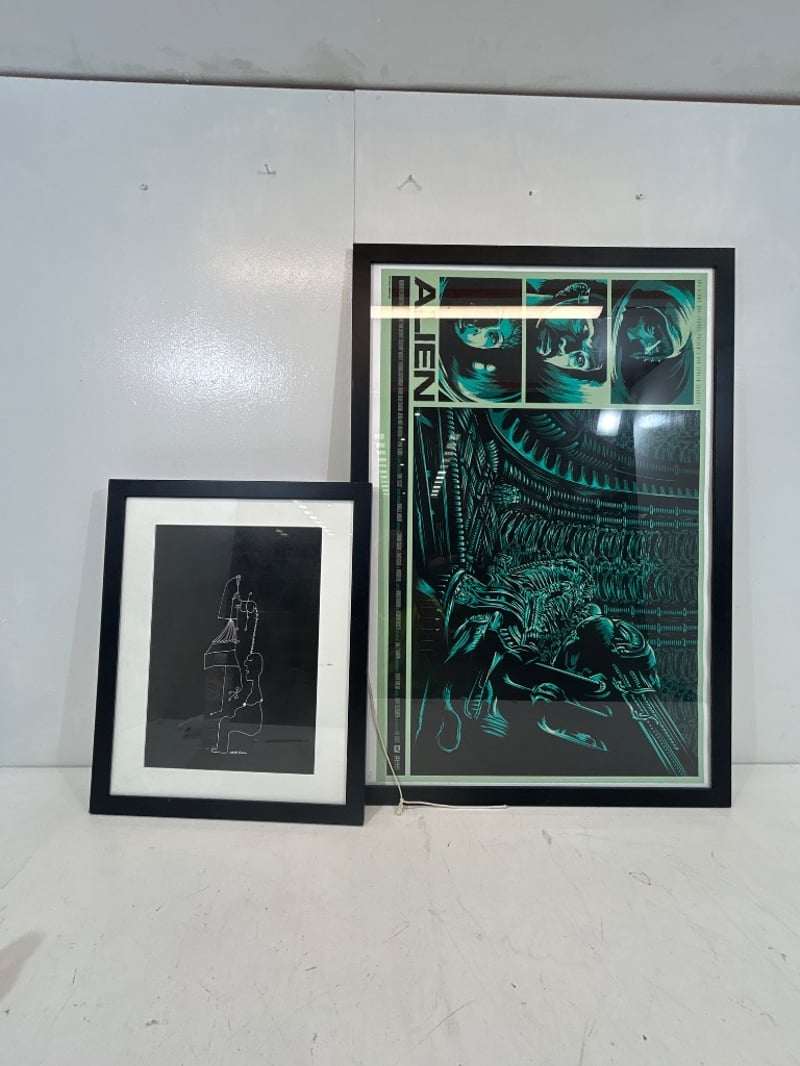 Assorted items include framed artwork and prints, including a large Alien (sci-fi) themed framed poster and a smaller framed minimalist line-art print