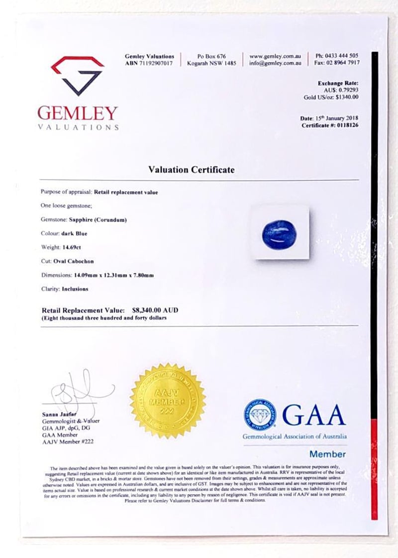 14.69CT OVAL CABOCHON CUT SAPPHIRE Oval Cabochon Cut, Dark Blue, Dimensions 14.09 X 12.31 X 7.80Mm, Loose, Unset, Clarity: Inclusions. Jewellery Valuations Provided By A Third Party Professional Not Directly Associated With Lloyds Auctions at AUD $8340 This Insurance Valuation has been provided by a registered Jewellery Valuer and is intended for insurance purposes only. The valuation amount has no bearing on the auction value of the item. Any questions regarding the valuation should be directed to the issuing Valuer (refer to contact details on the certificate) as Lloyds have no association or relationship with the Valuer or the valuation amount contained within the valuation. 0 FC1 163022+5