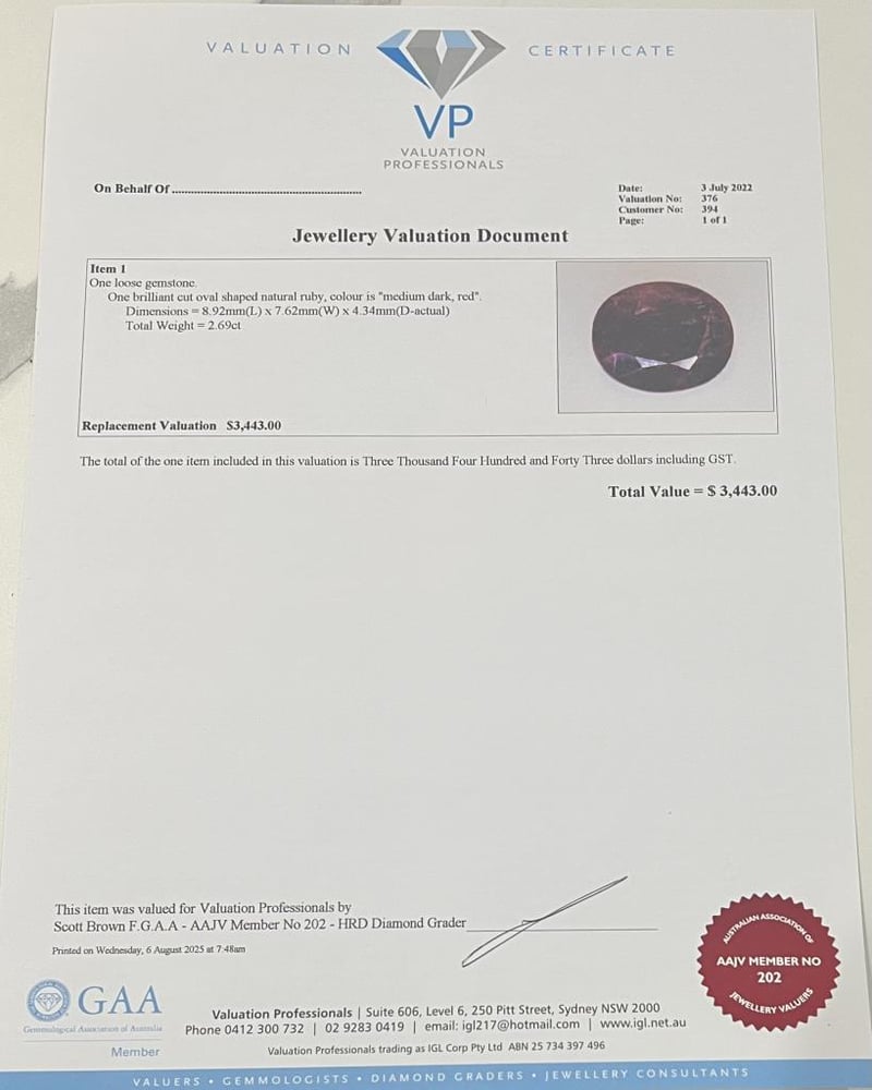 2.69 CARAT NATURAL RUBY OVAL SHAPE VALUATION $3443 Valuations Provided by an Independent Third-Party Professional Not Directly Associated With Lloyds Auctions at AUD $3443This valuation has been conducted by an independent third-party professional. The valuation amount is an assessment by the issuing valuer and does not reflect the auction value of the item. Any inquiries regarding the valuation should be directed to the issuing valuer (refer to contact details on the certificate), as Lloyds Auctions has no affiliation or influence over the valuation, the valuer, or the stated amount. Condition: Good - Refer Images 0311152+11