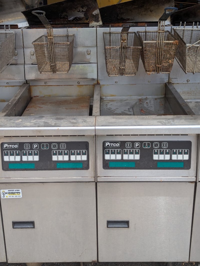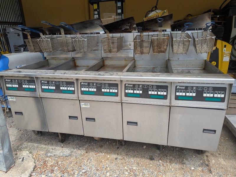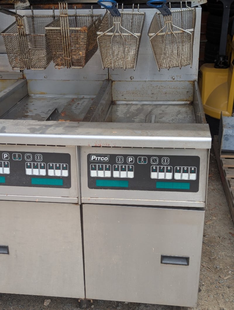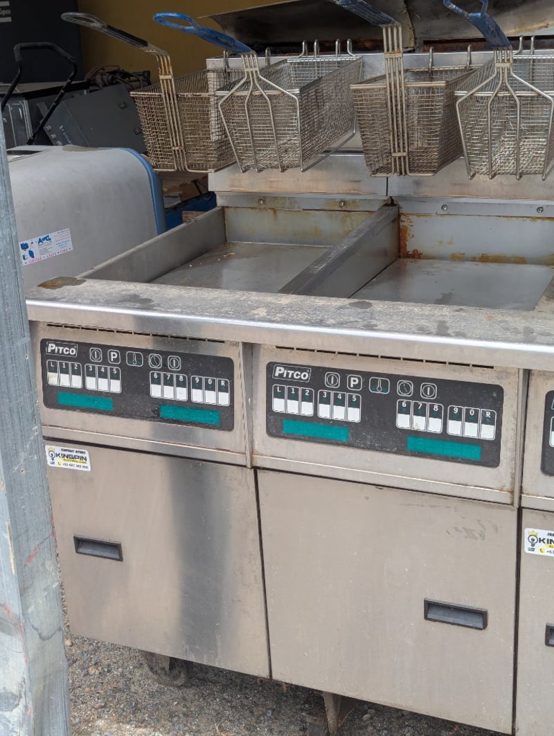 Commercial deep fryer bank, Pitco, 5 x separate fry potsAdditional filter pan and drain pipeDimensions: H 135cm x W 200cm x D 90cm