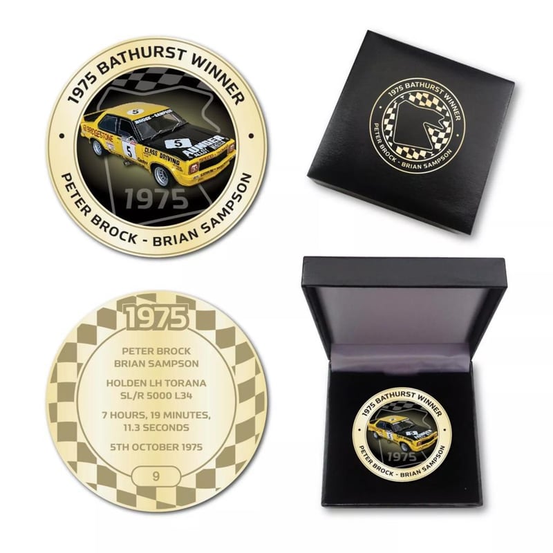 1975 BATHURST WINNER ANTIQUE GOLD MEDALLION IN BOX PETER BROCK HOLDEN LH TORANACELEBRATE THE WINNERS OF THE BATHURST 1000 WITH THE BATHURST MEDALLIONS SERIES.THIS MEDALLION FEATURES THE 1975 BATHURST WINNER - HOLDEN LH TORANA SL/R 5000 L34 DRIVEN BY PETER BROCK AND BRIAN SAMPSON.A FANTASTIC COLLECTORS ITEM, THEY FEATURE THE WINNERS OF THE GREAT RACE ON A COLOURED DISC, MOUNTED ON THE ANTIQUE GOLD COLOURED MEDALLION. THESE COME PRESENTED IN GIFT BOX PACKAGING. EACH MEDALLION IS NUMBERED ON THE REVERSE, WITH INFORMATION ABOUT EACH WINNER INSCRIBED INSIDE A CHEQURED FLAG BORDER.LIMITED EDITION OF 2000.THE MEDALLION IS 60MM IN DIAMETER AND 4MM THICK. THE BOX MEASURES 100MM X 100MM X 33MM. COLLECT THE ENTIRE SERIES OF MEDALLIONS FROM 1963-2020.MATERIAL: ZINC ALLOYFINISHING:GOLD PLATEDNOVELTY COIN THESE ARE MADE FROM GOLD PLATED FOIL AND ARE NOT REAL GOLD OR SILVER, NOT A LEGAL TENDER. 311151+77