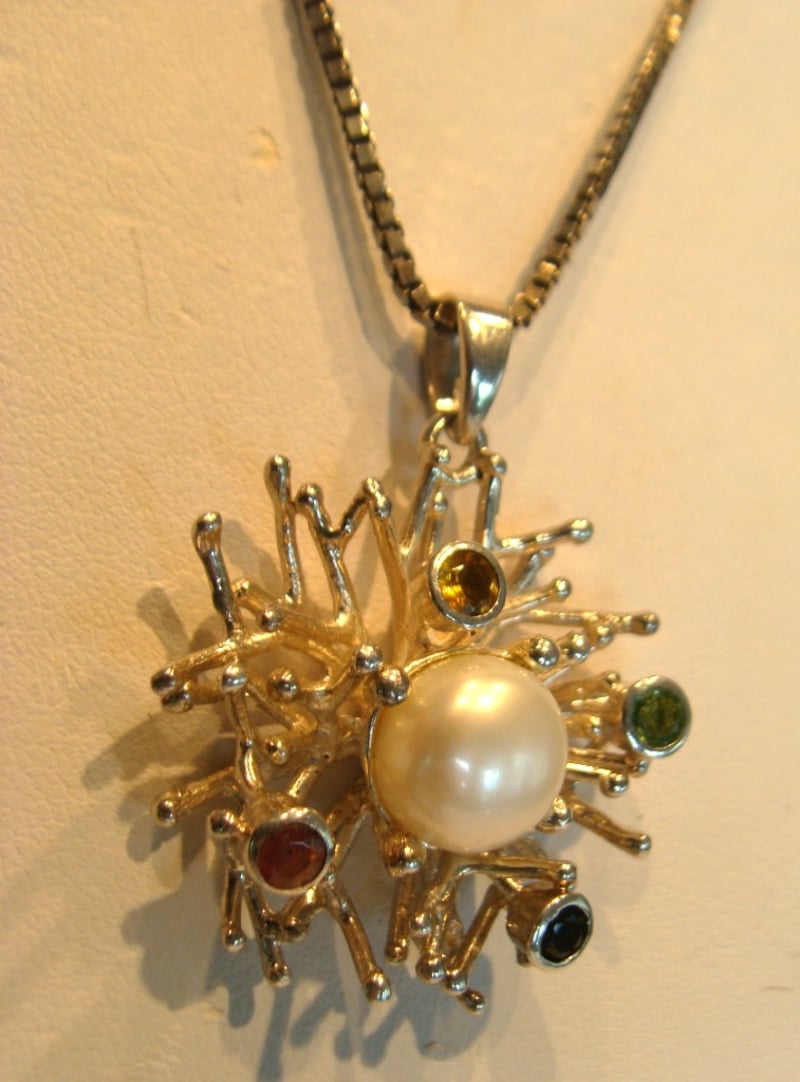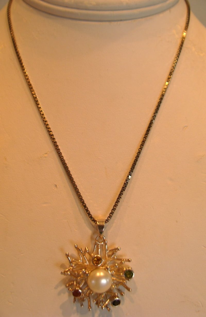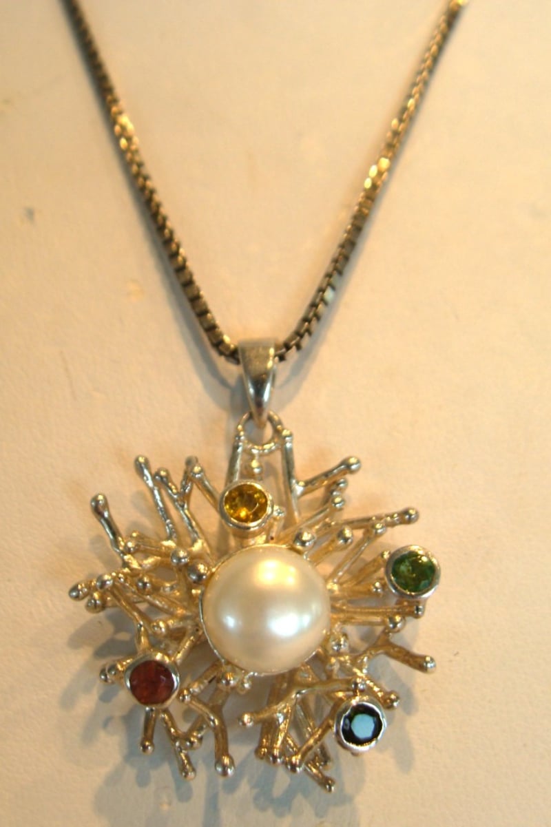 STERLING SILVER 925 PENDANT WITH NATURAL PEARL & GEMSTOMES ON ITALIAN STERLING SILVER 925 BOX CHAIN Condition: Good - Refer To Images 9A 586270+2