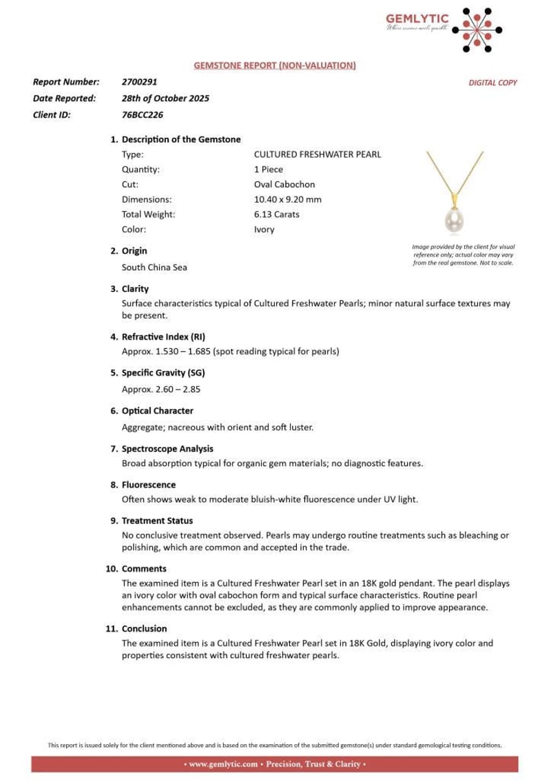 Conclusion: The Examined Item Is A Cultured Freshwater Pearl Set In 18K Gold, Displaying Ivory Color And Properties Consistent With Cultured Freshwater Pearls.