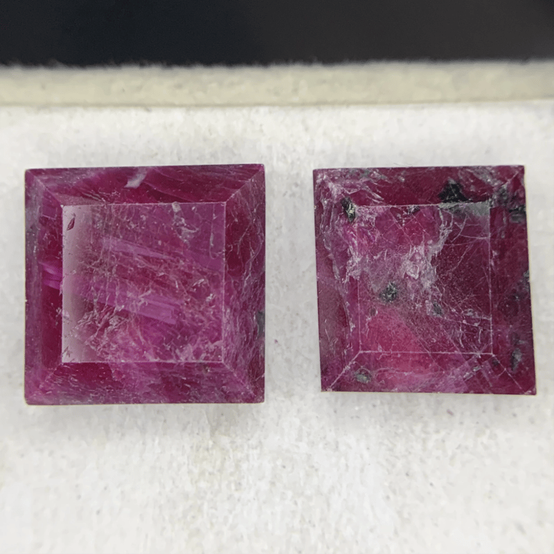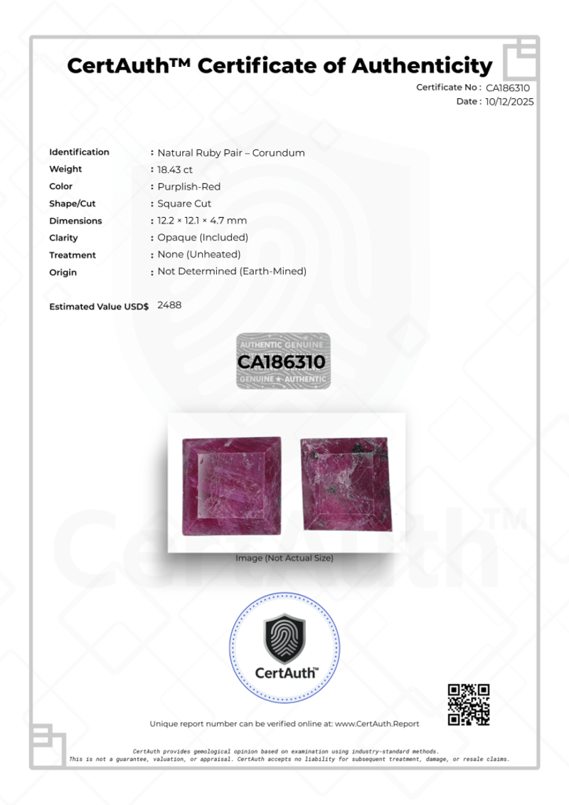 This Auction Features A Substantial Matched Pair Of Natural Rubies (Corundum) With A Total Weight Of 18.43 Carats. The Gemstones Display A Purplish-Red Hue And Are Fashioned In A Square Cut. These Earth-Mined Stones Are Untreated (Unheated) And Have Opaque (Included) Clarity. The Pair Includes A Certauth Certificate Of Authenticity.