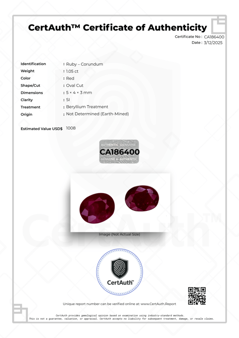 This Lot Features A Matched Pair Of Rubies (Corundum) With A Combined Weight Of 1.05 Carats. The Gemstones Display A Classic Red Hue And Are Fashioned In An Oval Cut. These Earth-Mined Stones Have A Clarity Grade Of Si And Have Undergone Beryllium Treatment To Enhance Their Color And Appearance. The Lot Includes The Original Certauth Certificate Of Authenticity.
