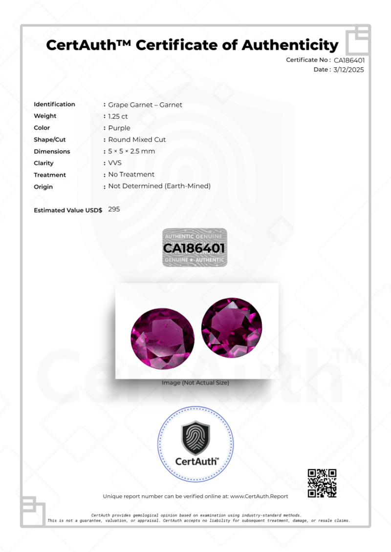 1.25CT PAIR OF VVS PURPLE GRAPE GARNETS - ROUND MIXED CUT (CERTIFIED EARTH-MINED) This Lot Features A Stunning Matched Pair Of Grape Garnets, Weighing A Total Of 1.25 Carats. Known For Their Distinct And Vibrant Purple Hue, These Garnets Display Excellent Clarity And Brilliance. The Stones Have Been Fashioned Into A Classic Round Mixed Cut, Maximizing Their Sparkle. These Are Natural, Earth-Mined Gemstones With No Treatments, As Verified By The Accompanying Certauth Certificate. A Beautiful Choice For Custom Earrings Or Accent Stones In Fine Jewellery. Details: • Gemstone: Grape Garnet (Natural Garnet) • Carat Weight: 1.25 Ct • Colour: Purple • Cut: Round Mixed Cut • Clarity: Vvs • Treatment: No Treatment • Metal: N/A • Dimensions: 5 X 5 X 2.5 Mm • Ring Size: N/A • Origin: Not Determined (Earth-Mined) • Certification: Certauth Certificate Included (No: Ca186401) • Estimated Value: $295 Usd Condition: Good - Refer Images 0 488395+186401