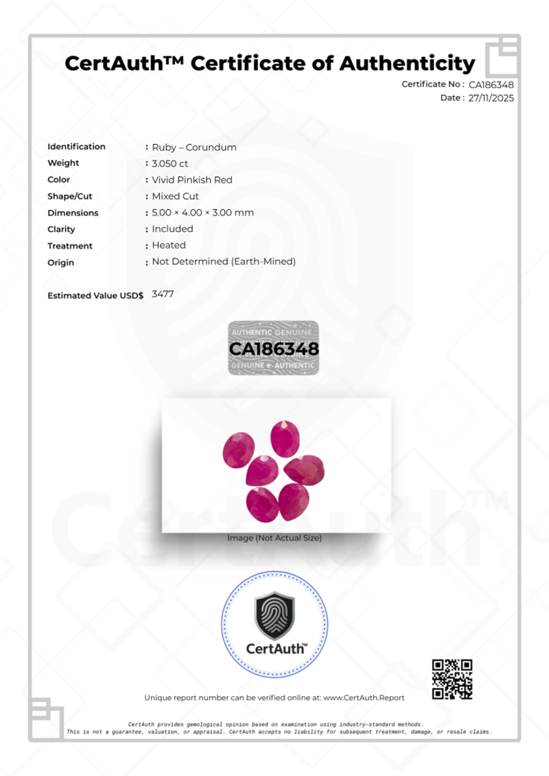 3.050 CT PARCEL OF VIVID PINKISH RED RUBIES - MIXED CUT This Lot Features A Parcel Of Natural Corundum Rubies With A Total Weight Of 3.050 Carats. These Gemstones Exhibit A Vibrant Vivid Pinkish Red Color And Are Fashioned In A Mixed Cut, Consisting Of Pear And Oval Shapes. The Clarity Is Graded As Included, And The Stones Have Been Treated With Heat. These Earth-Mined Gems Are Perfect For Creating Multi-Stone Jewelry Pieces. Accompanied By Certauth Certificate Of Authenticity Ca186348.Details:• Gemstone: Ruby – Corundum• Carat Weight: 3.050 Ct• Colour: Vivid Pinkish Red• Cut: Mixed Cut• Clarity: Included• Treatment: Heated• Dimensions: 5.00 X 4.00 X 3.00 Mm• Origin: Not Determined (Earth-Mined)• Certification: Certauth Certificate No. Ca186348• Estimated Value: Usd 3,477 Condition: Good - Refer Images 0488395+186348