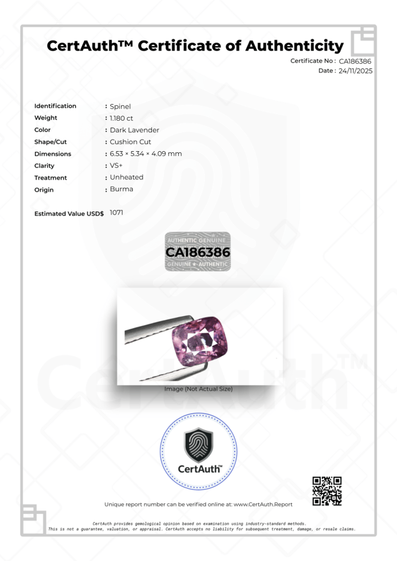 This Auction Highlights A Sophisticated 1.180 Carat Spinel Gemstone From Burma. The Gem Exhibits A Unique Dark Lavender Hue And Is Fashioned In A Cushion Cut. Notably, This Stone Is Certified As Unheated, Preserving Its Natural Color Without Thermal Enhancement. The Clarity Is Graded As Vs+, Indicating High Transparency And Quality. It Is Accompanied By Certauth Certificate Of Authenticity Ca186386.