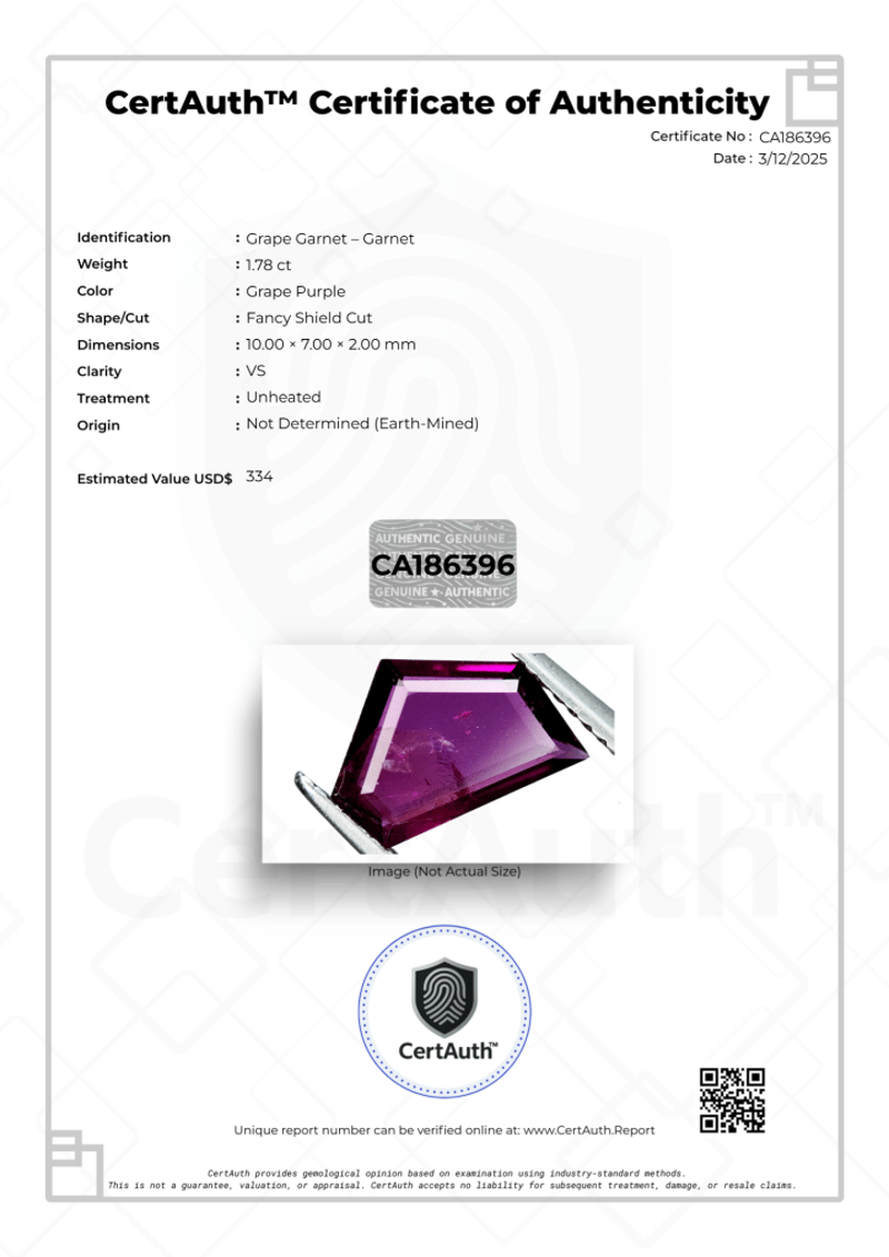 This Auction Features A Unique 1.78 Carat Garnet With A Distinct Grape Purple Hue. The Gemstone Is Cut In An Eye-Catching Fancy Shield Cut. It Is Certified As Unheated, Maintaining Its Natural Color Without Enhancement. The Clarity Is Graded As Vs, Ensuring Good Transparency And Brilliance. This Earth-Mined Gemstone Is Accompanied By Certauth Certificate Of Authenticity Ca186396.