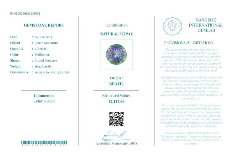 26.47 CARATS CERTIFIED NATURAL TOPAZ Gemstone : Natural TopazCertificate Number : Bigl20240122131931Weight : 26.47 CaratsColor : MulticolorMeasurement : 20.05 X 20.02 X 13.25 MmShape : Round ConcaveQuantity : 1 PieceOrigin : BrazilComments : Color Coated• Use The Qr Code On The Packaging To View And Download The Certificate. • Verify Report Online At Www.Bangkokinternationalgemlab.Co 0+15