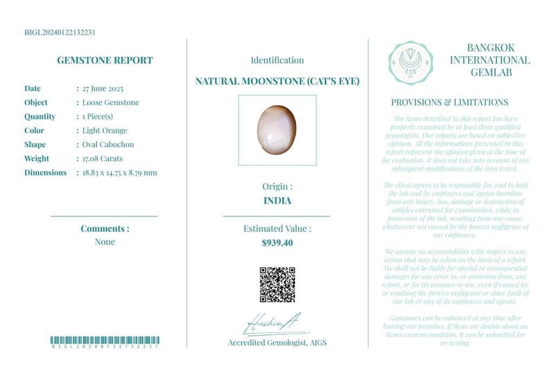 17.08 CARATS CERTIFIED NATURAL MOONSTONE (CAT'S EYE) Gemstone : Natural Moonstone (Cat'S Eye)Certificate Number : Bigl20240122132231Weight : 17.08 CaratsColor : Light OrangeMeasurement : 18.83 X 14.75 X 8.79 MmShape : Oval CabochonQuantity : 1 PieceOrigin : IndiaComments : None• Use The Qr Code On The Packaging To View And Download The Certificate. • Verify Report Online At Www.Bangkokinternationalgemlab.Co 0+35
