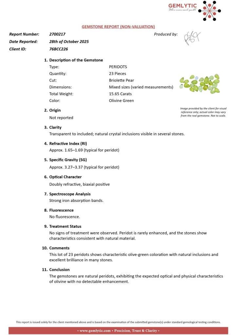 PERIDOTS - 15.65 CARATS - OLIVINE GREEN Quantity: 23 PcsReport Number: 2700217Clarity: Transparent To Included; Natural Crystal Inclusions Visible In Several Stones.Measurements: Mixed SizesTreatments: No Signs Of Treatment Were Observed. Peridot Is Rarely Enhanced, And The Stones Show Characteristics Consistent With Natural Material.Origin: Not ReportedRefractive Index: Approx. 1.65–1.69 (Typical For Peridot)Specific Gravity: Approx. 3.27–3.37 (Typical For Peridot)Spectroscope Analysis: Strong Iron Absorption Bands.Fluorescence: No Fluorescence.Comments: This Lot Of 23 Peridots Shows Characteristic Olive-Green Coloration With Natural Inclusions And Excellent Brilliance In Many Stones.Conclusion: The Gemstones Are Natural Peridots, Exhibiting The Expected Optical And Physical Characteristics Of Olivine With No Detectable Enhancement. Condition: Good - Refer Images 0488396+33