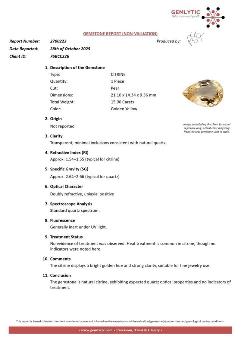 CITRINE - 15.96 CARATS - GOLDEN YELLOW Quantity: 1 PcsReport Number: 2700223Clarity: Transparent; Minimal Inclusions Consistent With Natural Quartz.Measurements: 21.10 X 14.34 X 9.36Treatments: No Evidence Of Treatment Was Observed. Heat Treatment Is Common In Citrine, Though No Indicators Were Noted Here.Origin: Not ReportedRefractive Index: Approx. 1.54–1.55 (Typical For Citrine)Specific Gravity: Approx. 2.64–2.66 (Typical For Quartz)Spectroscope Analysis: Standard Quartz Spectrum.Fluorescence: Generally Inert Under Uv Light.Comments: The Citrine Displays A Bright Golden Hue And Strong Clarity, Suitable For Fine Jewelry Use.Conclusion: The Gemstone Is Natural Citrine, Exhibiting Expected Quartz Optical Properties And No Indicators Of Treatment. Condition: Good - Refer Images 0488396+39
