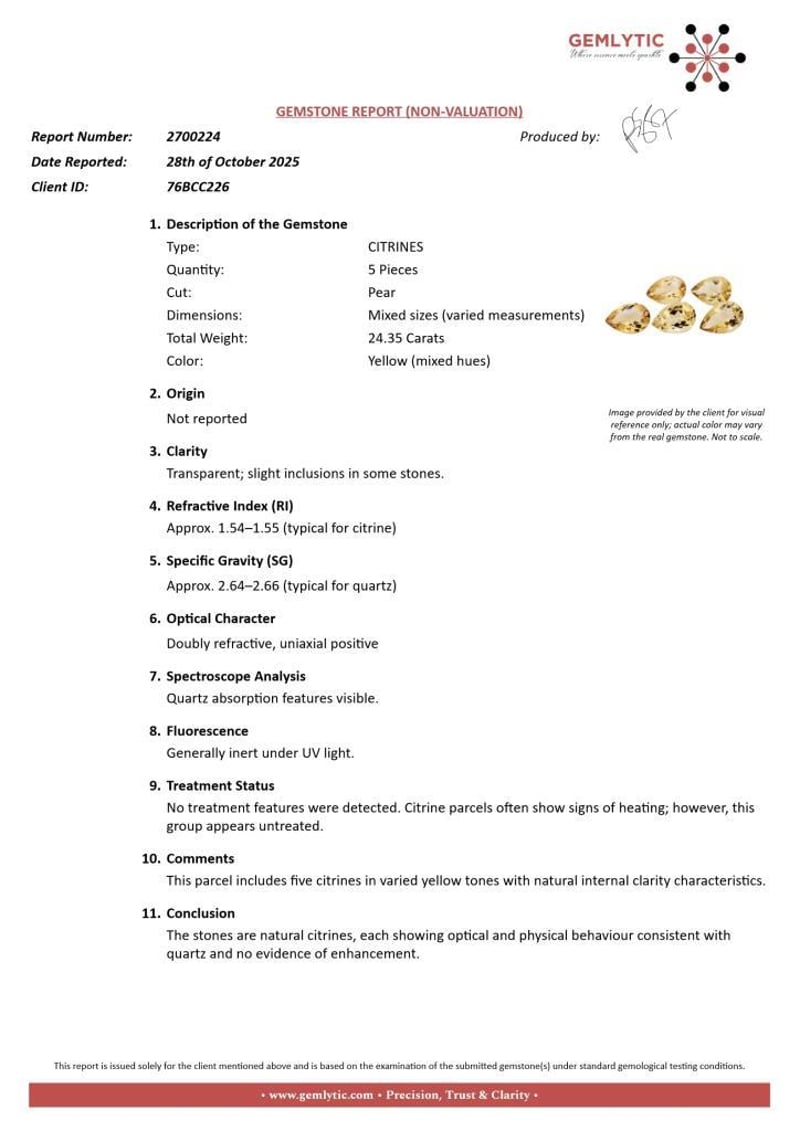 CITRINES - 24.35 CARATS - YELLOW (MIXED HUES) Quantity: 5 PcsReport Number: 2700224Clarity: Transparent; Slight Inclusions In Some Stones.Measurements: Mixed SizesTreatments: No Treatment Features Were Detected. Citrine Parcels Often Show Signs Of Heating; However, This Group Appears Untreated.Origin: Not ReportedRefractive Index: Approx. 1.54–1.55 (Typical For Citrine)Specific Gravity: Approx. 2.64–2.66 (Typical For Quartz)Spectroscope Analysis: Quartz Absorption Features Visible.Fluorescence: Generally Inert Under Uv Light.Comments: This Parcel Includes Five Citrines In Varied Yellow Tones With Natural Internal Clarity Characteristics.Conclusion: The Stones Are Natural Citrines, Each Showing Optical And Physical Behaviour Consistent With Quartz And No Evidence Of Enhancement. Condition: Good - Refer Images 0488396+40